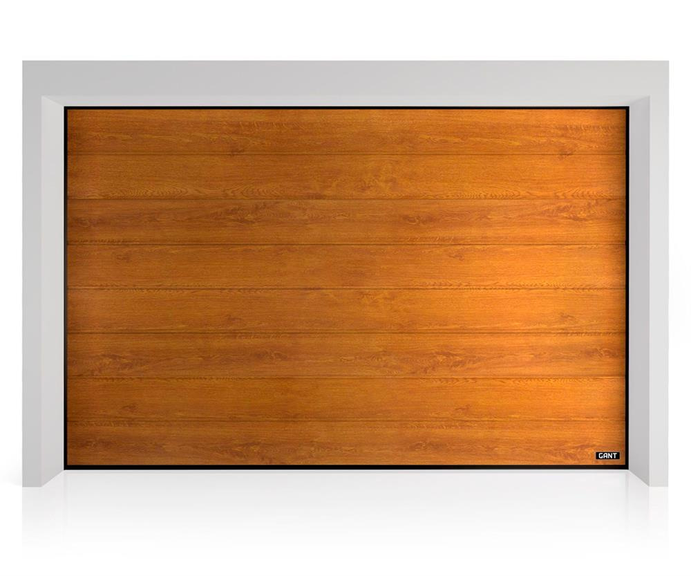 Детальні характеристики Секційні гаражні ворота Gant Plus - панель Широка лінія, розмір 2400x2200 мм., колір Золотий дуб. Ручне управління..