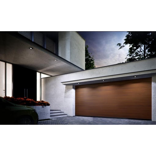Детальні характеристики Секційні гаражні ворота Gant Plus - панель Широка лінія, розмір 3500x2500 мм., колір Темний дуб (горіх). Ручне управління..