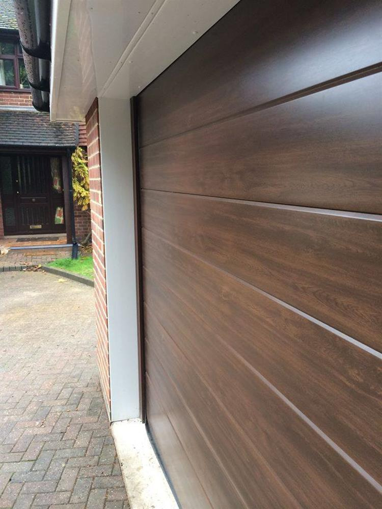 Детальні характеристики Секційні гаражні ворота Gant Plus - панель Широка лінія, розмір 3600x2800 мм., колір Темний дуб (горіх). Ручне управління..