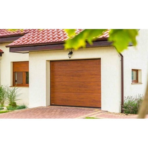 Детальні характеристики Секційні гаражні ворота Gant Plus - панель Широка лінія, розмір 4200x3000 мм., колір Золотий дуб. Ручне управління..