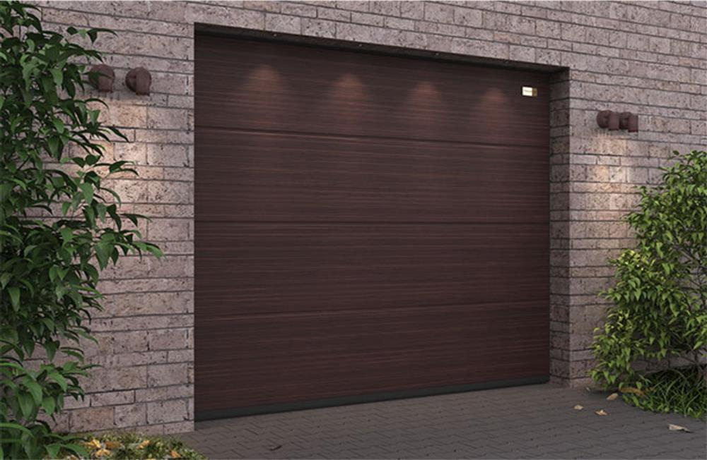 Детальні характеристики Секційні гаражні ворота Gant PR - панель Широка лінія, розмір 2400x2400 мм., колір Венге. Ручне управління..