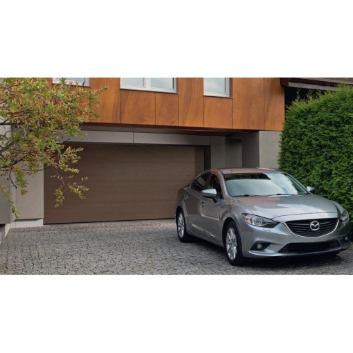 Детальні характеристики Секційні гаражні ворота Gant PR - панель Широка лінія, розмір 2400x2500 мм., колір Коричневий RAL 8014. Ручне управління..