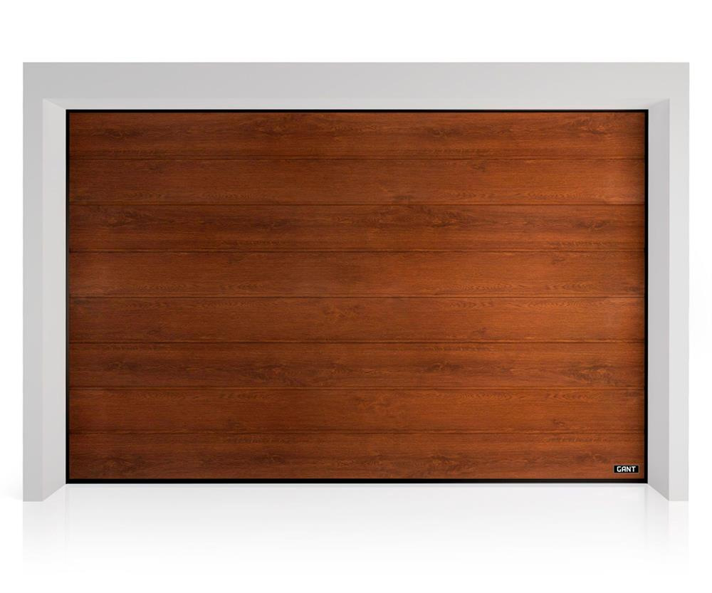 Детальні характеристики Секційні гаражні ворота Gant PR - панель Широка лінія, розмір 2600x2200 мм., колір Темний дуб (горіх). Ручне управління..