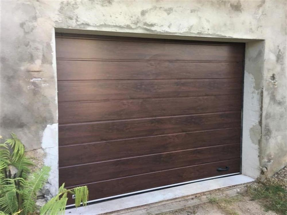 Детальні характеристики Секційні гаражні ворота Gant PR - панель Широка лінія, розмір 3300x2600 мм., колір Темний дуб (горіх). Ручне управління..