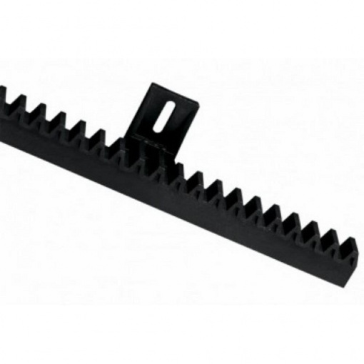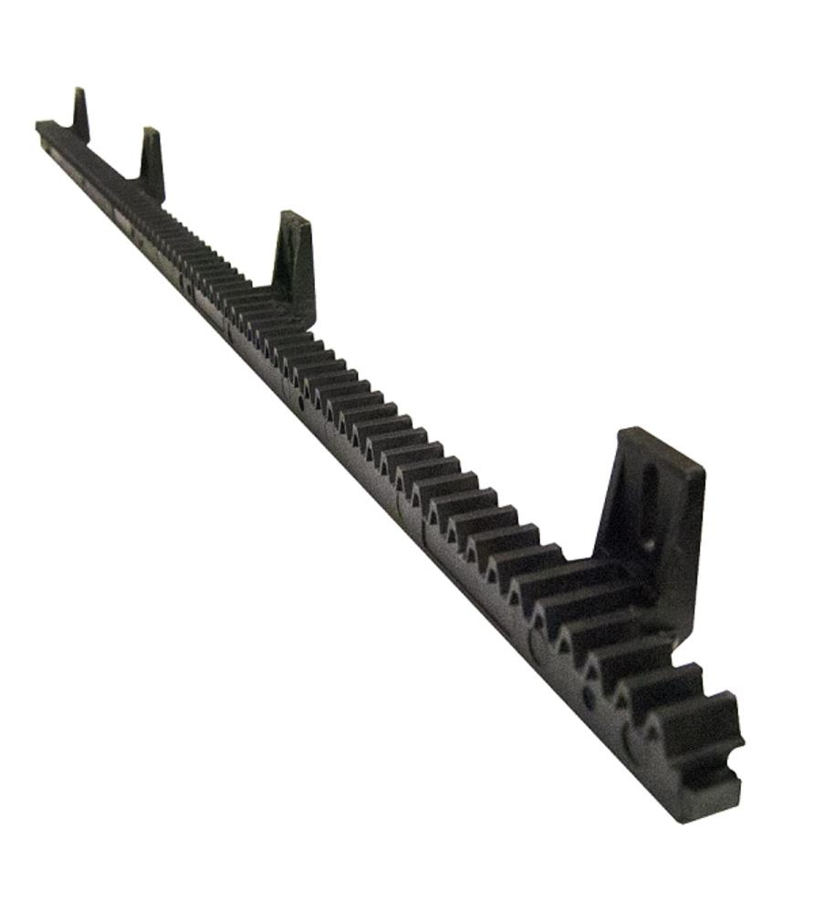Зубчаста рейка виготовлена з високоміцного полімеру, армованого скловолокном. Крім того, всередині по всій довжині, рейка армована сталевою вставкою, що забезпечує її міцність, стабільність розмірів і довговічність в експлуатації.Довжина однієї рейки 1000 мм, за допомогою спеціальних елементів на торцях передбачено з'єднання декількох рейок для набору необхідної довжини. Застосування полімеру дозволяє зменшити тертя, шум, ударні навантаження, забезпечити плавність ходу.